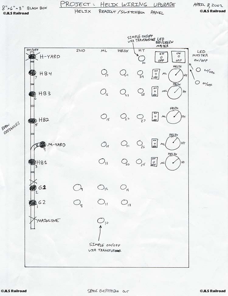 A detailed schematic of the new "Helix Leg Control Box" housing the newly created indicator readout system as well as the DC and AC circuitry of the upgraded Helix, H-Yard, M-Yard, and G-Blocks...