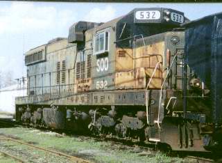 Here is 532. first built in 1954 as an EMD SD-9 and rebuilt in1975 as an SD-10. This big locomotive was a sort of Christmas present to the Whitewater, as she arrived in December 2001.She is to be restored to her Milwaukee Road colors as requested by her donor. I'm told she rides our rails as if she were riding on glass, unlike our switchers. And that she has more than enough power to pull whatever we put behind her.This is our biggest locomotive and a welcome addition.