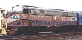 Now for the E units. 4258 was built in April 1953.She is an ex-MARC, ex-NJT locomotive but started as an IC engine.Her paint may be rough but, I'm told, there's a sound machine under the rough exterior.
