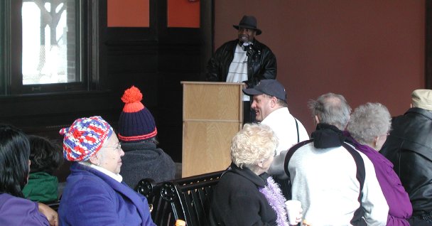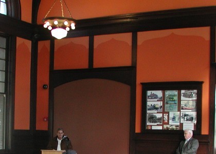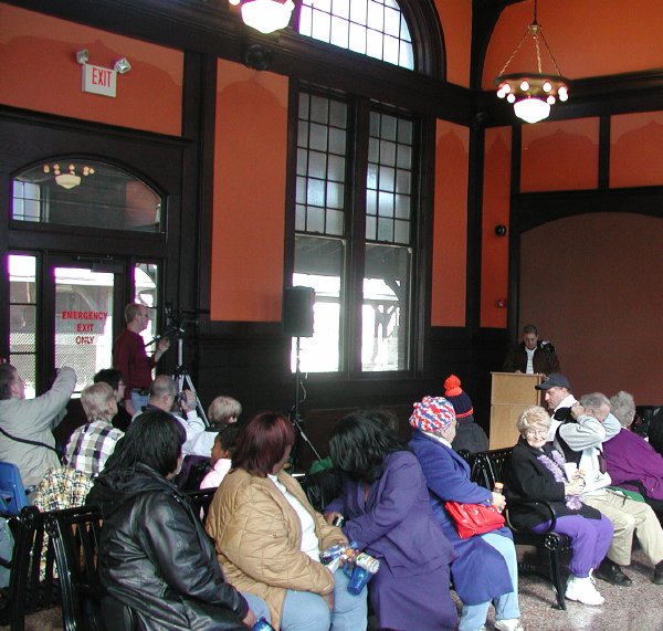 Wisconsin Assemby Rep. John Lehman may have best described the attendees at re-dedication of Racine's State Street train station on Saturday, Oct. 14, 2006, when he observed that key policymakers of today, neighborhood revitalizers past and present, plus early boosters of Kenosha-Racine-Milwaukee commuter trains and others eager for community renewal had found a common ground within the cavernous waiting room. Altogether, perhaps fifty fans of the station and its various roles in various lives gathered at mid-morning to hear Wisc. DOT Sec. Frank Busalacchi pay homage to the building and its place in Racine's history, to the contribution it will make to modern regional transit, to prospective KRM commuter trains and the broad support for future growth which the station gives focus to.