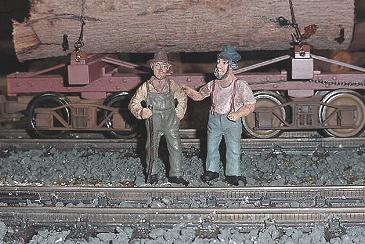 They hurried over and imediately started inspecting the module. These modelers did one fine job! While they were looking around a long logging train passed by. The smell of the freshly cut logs and the pounding of the loaded skeletons on the rails brought smiles to their faces. Well, at least it brought a smile to Stumpy’s face. Slim, on the other hand, felt the rather immediate need to heed the call of nature.