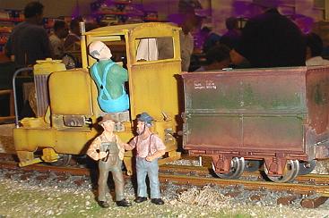 Just then they saw an angry crowd headed their way, with a policeman in the lead. Their short visit to the New Hampshire Garden RR Society’s modular layout had ended. They headed to the far end of the yard and luckily saw a critter pulling an ore car away from the crowd. They were really scared when they saw the huge engineer ~ these 7/8ths scale models by Bob McCown were the first they had ever seen. But they were even more afraid of the angry crowd that was headed their way, so they climbed aboard and hid in an ore car.