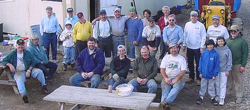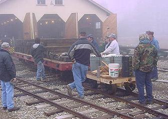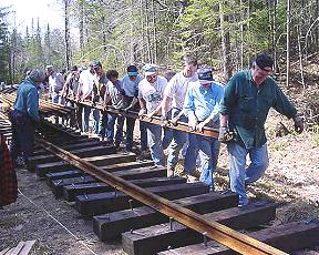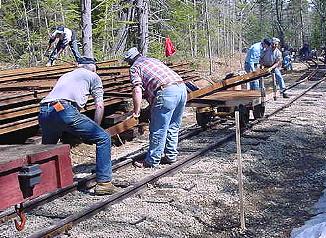 The Wiscasset, Waterville & Farmington Railway’s 2001 track laying weekend coincided with my 59th birthday--what better way to see if my advancing years were getting the best of me! So after work on Friday I drove 462 miles to Alna, Maine. I didn’t want to waste time stopping for food so I took along a bag of Baby Ruth candy bars and a 12-pack of Coke. Sounds healthy, eh? But the caffeine probably helped me stay awake after a busy week. I arrived at Sheepscot Station around 1:00am, and after a quick trip to the “green house” I crawled into my car for a few hours of shut-eye. Luckily I’m not bothered by cold weather so I was plenty warm in my sleeping bag.