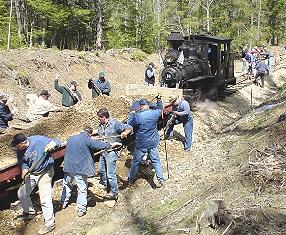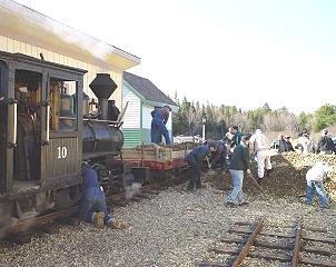 I had to pass on the Wiscasset, Waterville & Farmington Railway’s 2002 track laying during the long Columbus Day weekend. A visit from Sophie, my Colorado granddaughter, took priority ~ other grandfathers will understand! But there was no way that I would miss the ballasting weekend in late April, so after work on Friday I drove the 462 miles to Alna, Maine. As I did last year, I didn’t want to waste time stopping for food so I took along a bag of candy bars and a 12-pack of Coke. I arrived at Sheepscot Station around 1:30am, made a quick trip to the “green house,” and crawled into my car for a few hours of shut-eye. After biscuits and gravy at Karen’s Kitchen I was ready for work. When I arrived back at Sheepscot Station I saw what was ahead for us ~ a lot of that ballast and gravel had to be put on the WW&F right-of-way. By us! The front end loader had broken down the previous day, so we had to load flatcar 118 by hand for our first trip. Luckily it was repaired for all later loads ~ otherwise I might have needed some repairs myself!