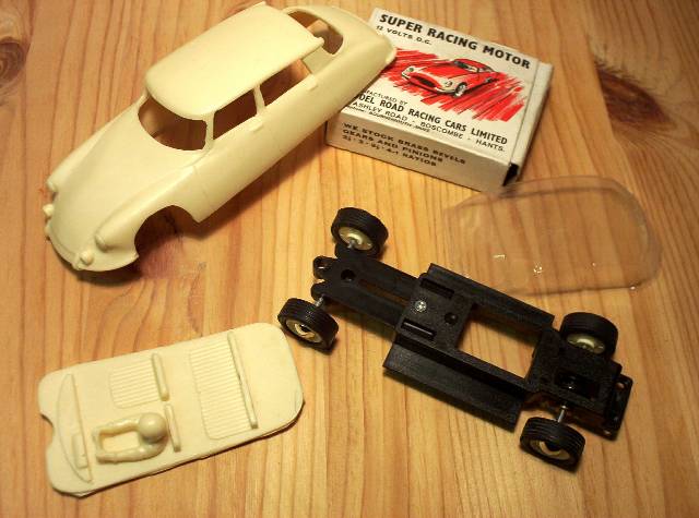 De onderdelen voor de citroën ID19 zijn hier afgebeeld. Een kunsthars kap met interieur en termoform ruitje.