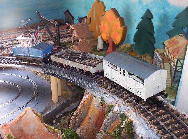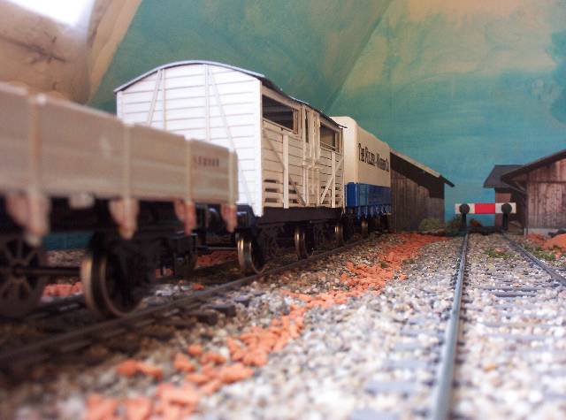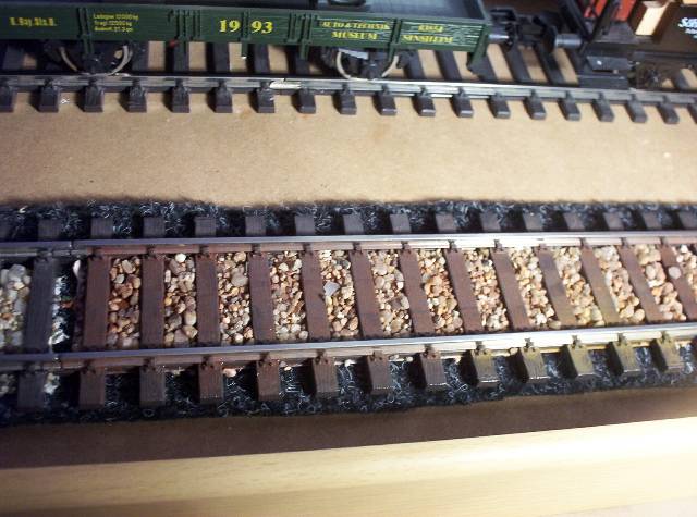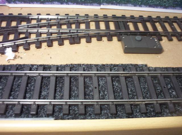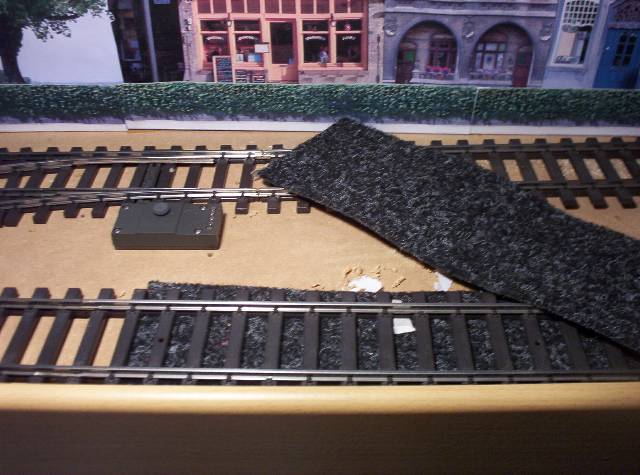 De rails ligt op een ondergrond van projecttapijt, dit heeft precies de juiste dikte en dempt tevens het geluid. Met een stevige schaar kun je het projecttapijt knippen in de juiste vorm. Je bevestigt het projecttapijt op de ondergrond met dubbelzijdig plakband.