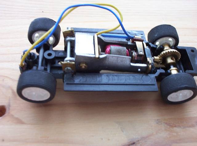 Het eerste proefrondje had tot gevolg dat ik het onderstel toach aan wilde passen. De Scalextric Mabuchi is een prima motor, maar eigenlijk wel erg snel voor zo´n oud rallybeest. Ik zocht