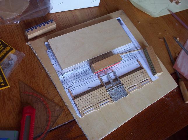 Je begint te bouwen met het onderstel. Dit bestaat uit een houten plaatje en enkele latjes. Het lijmen kan heel goed met witte houtlijm, dan heb je ook nog enige tijd om de onderdelen op de juiste plaats te zetten. De witmetalen deuren heb ik met epoxy (tweecomponentenlijm van de Hema) vastgezet. Het is heel belangrijk om haaks te werken. Ik heb als ondersteuning de tekening gecopieerd en heb de zijwanden op de tekening gebouwd.