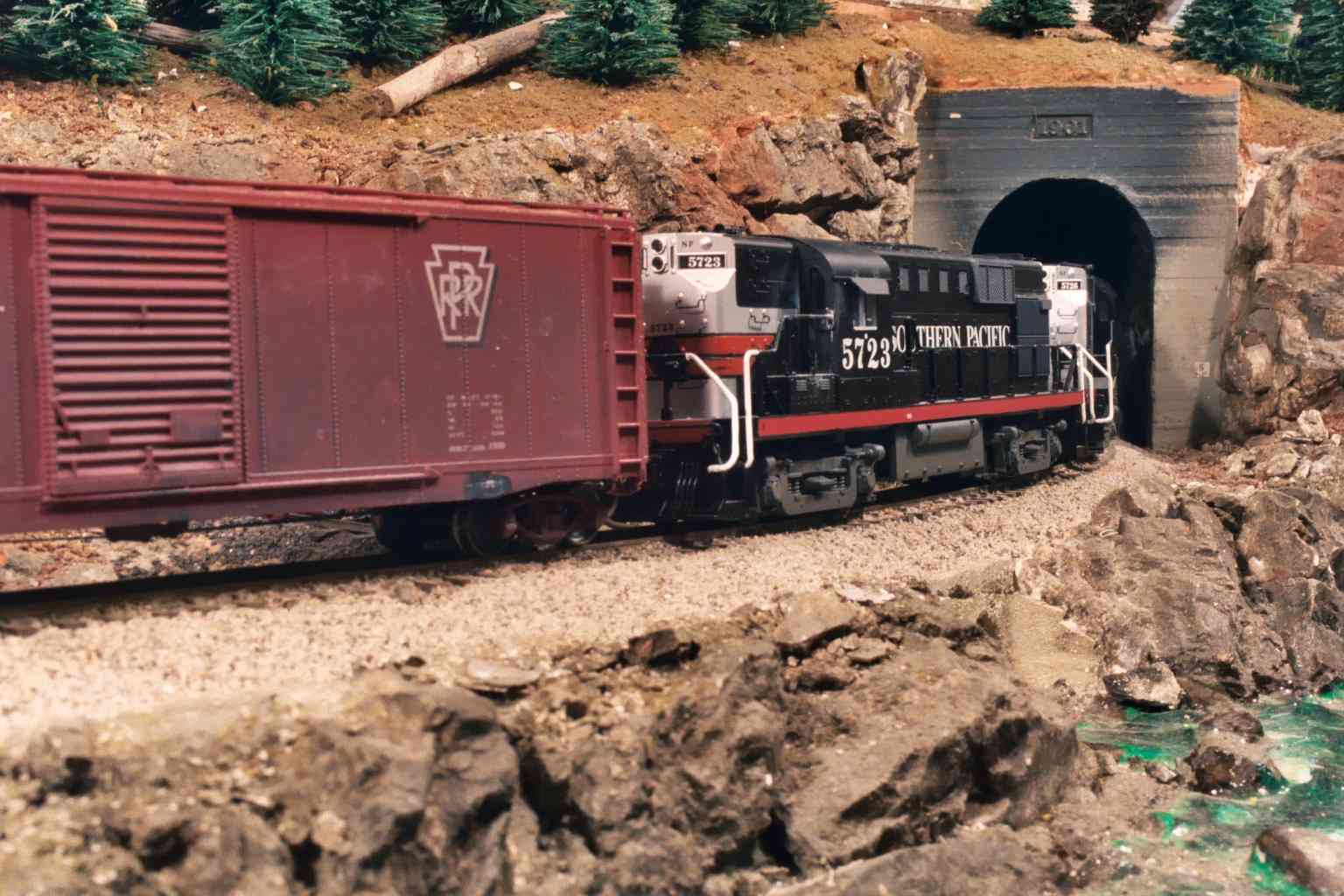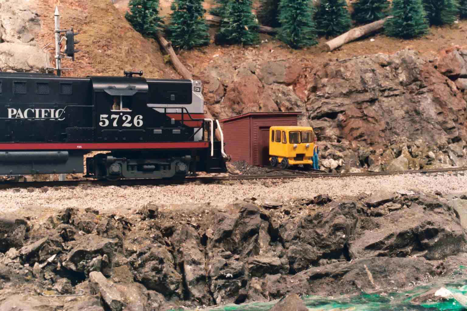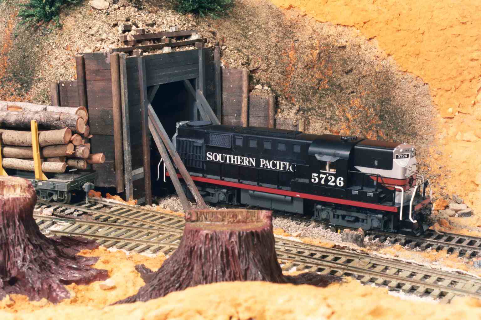 The east end of Tunnel 4 opens into the valley where the small logging town of Loma Linda is located. Scenery work here is still in progress.