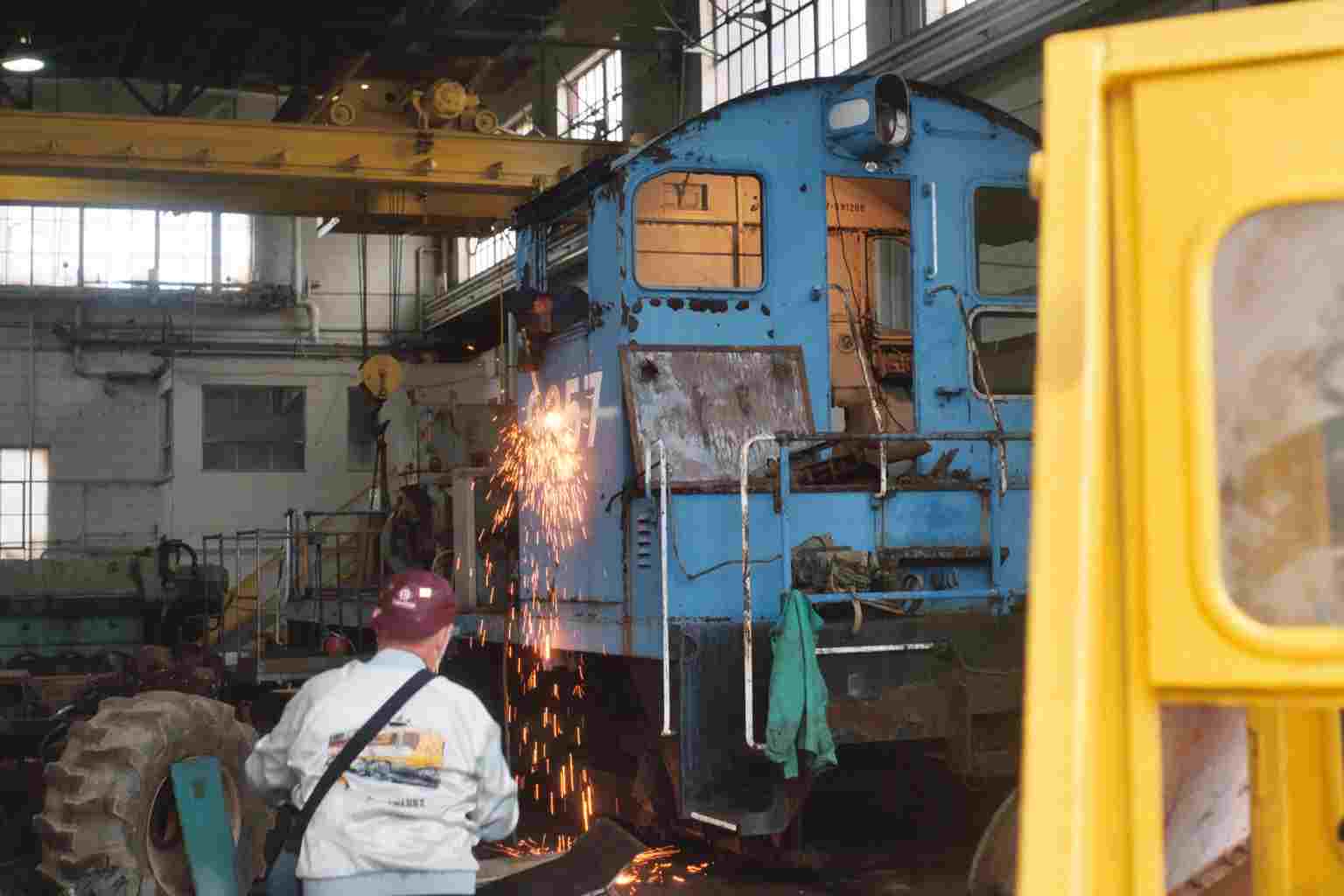 Inside the shop is a working overhead crane, but all that's happening is a former Conrail SW1200 being cut up (photo below), no different from what's happening to other locos in the rain outside.