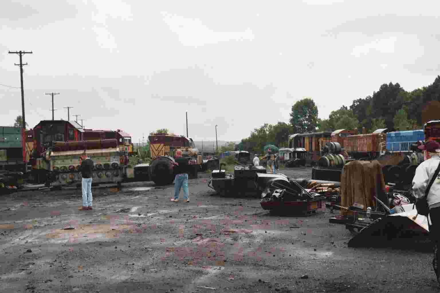 As well as the ELHS members in the shot, you can see, from left to right, an EMD Spartan cab; an EMD 16-cylinder prime mover; a traction motor blower with the hulk of a loco ready for scrap behind it; an EMD fuel tank; some unidentifiable bits and pieces; and an EMD second-generation long hood end; behind it are some EMD switchers and GPs that may have a little life in them yet.