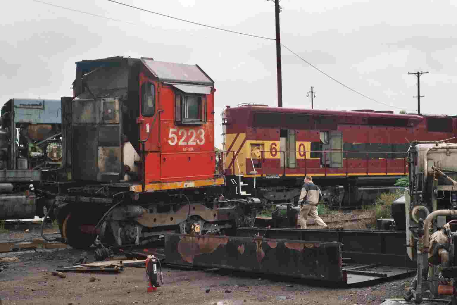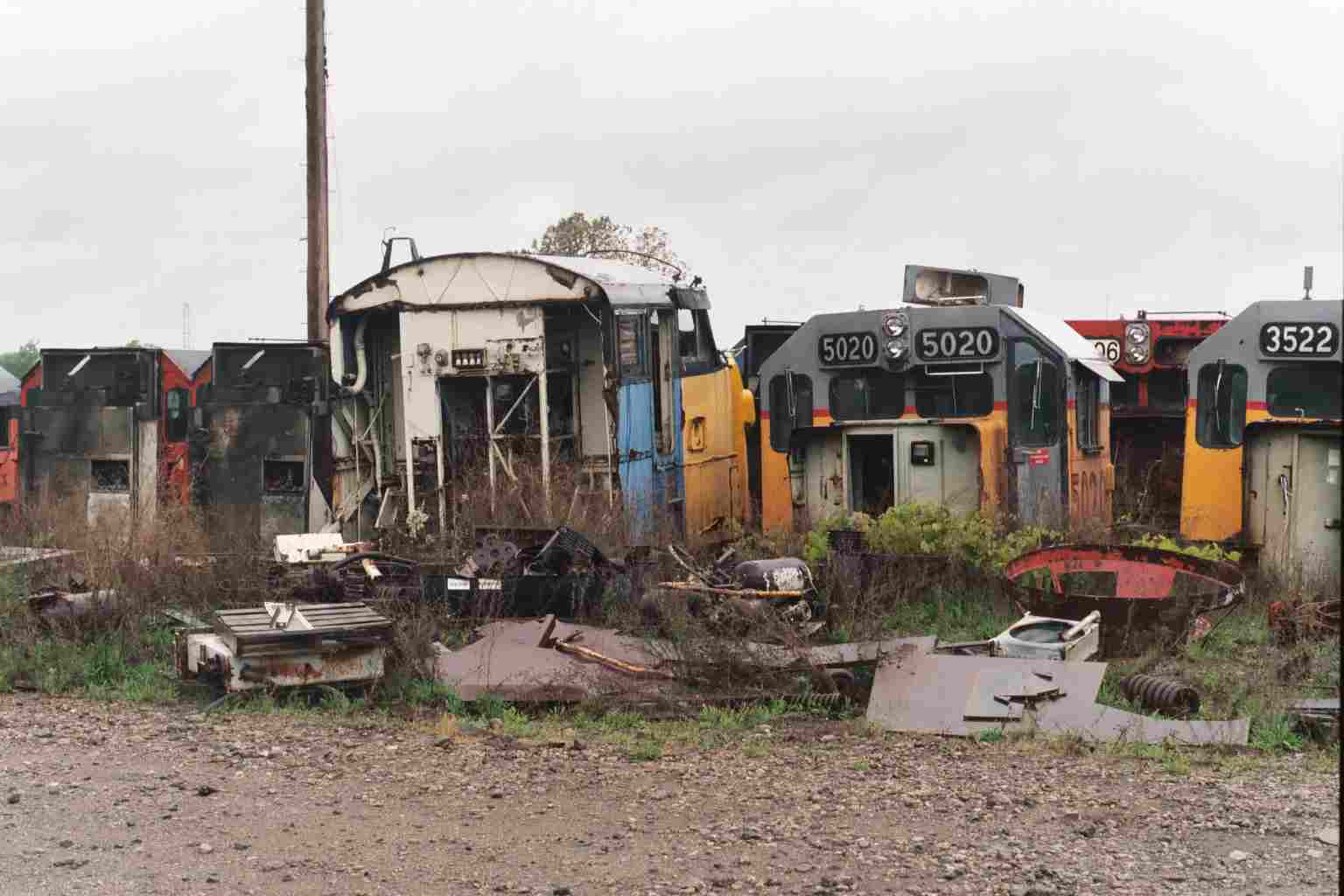 Scrapping generally seems to begin with the long hood, removal of the prime mover and other equipment, and cutting up the frame behind the cab. That's the electrical cabinet sticking out to the left of CN 5223's cab. The front of the loco was to the right.