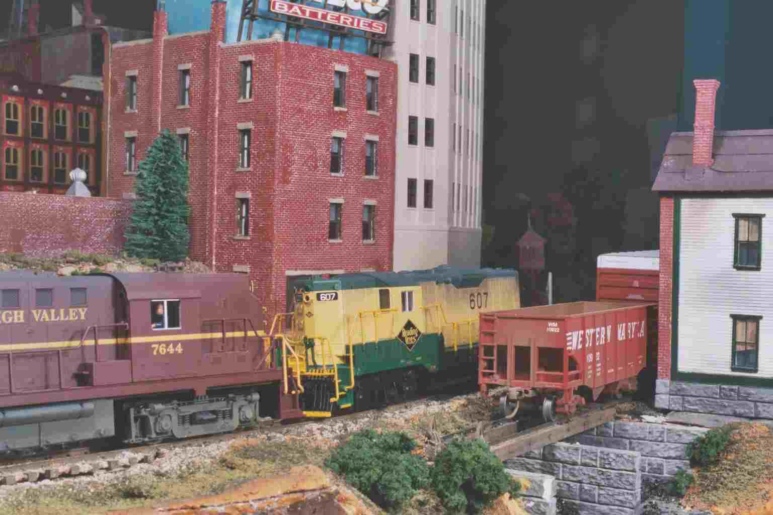 The local rounds the sharp curve out of Zenith Yard and into West Zenith, where its first work is to pick up the WM hopper that you can see on the right at City Coal and Fuel. It will also pick up a CP Rail box at Zenith Knitting Mills, which shares the spur with City Coal, and it will drop a loaded Virginian hopper there, as well as a Seaboard box car at Zenith Knitting Mills.