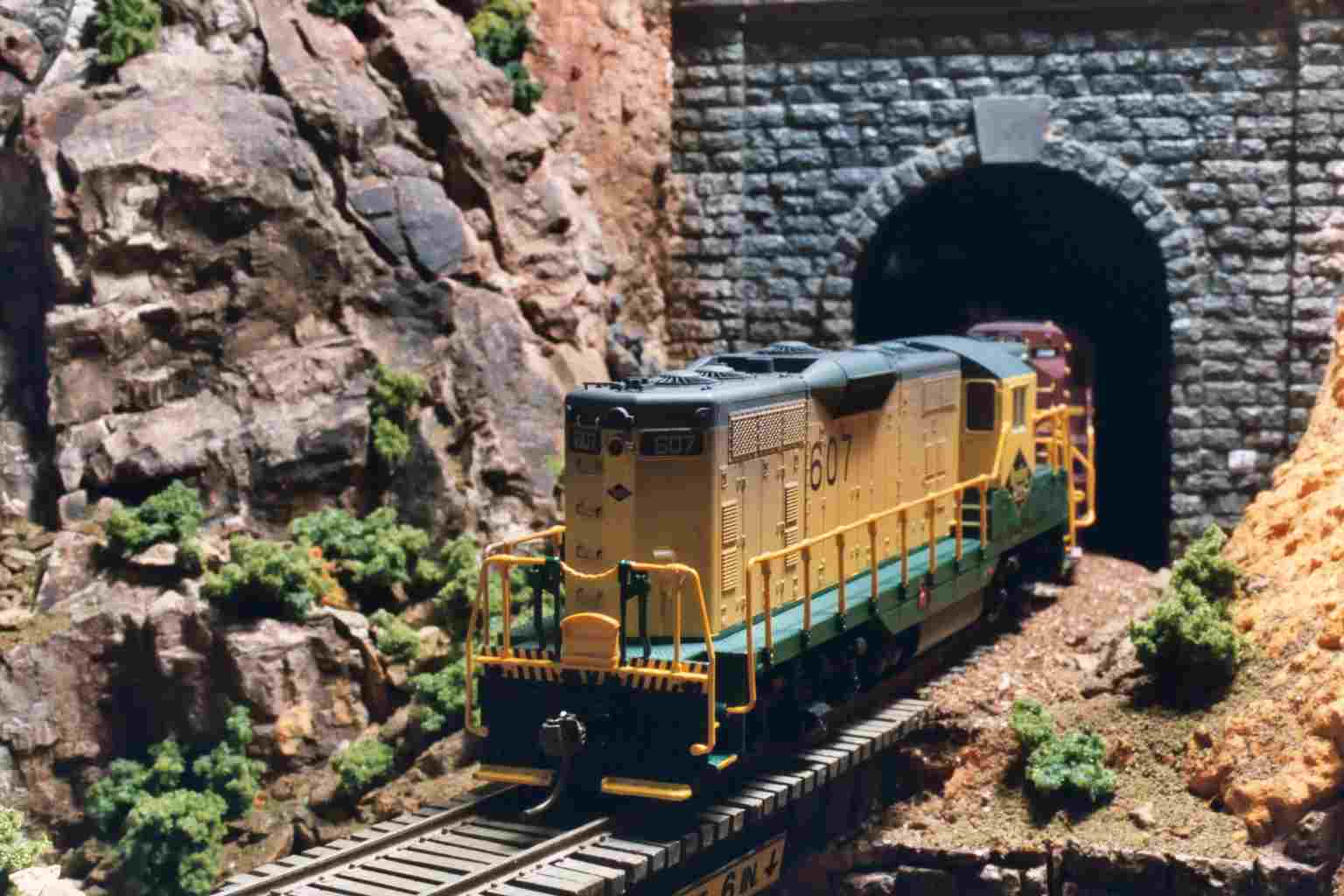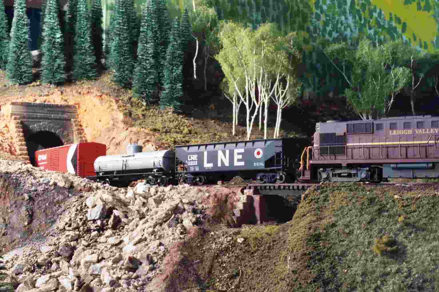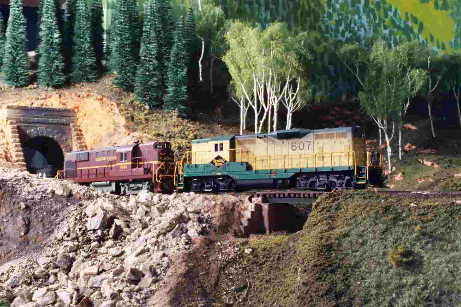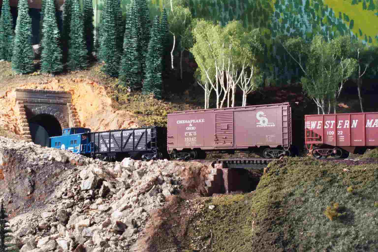 The next stop is in fact at Terrible, on the other side of Tennessee Pass. Here we see the local emerging from the Tennessee Pass tunnel. This is the highest point on the layout.