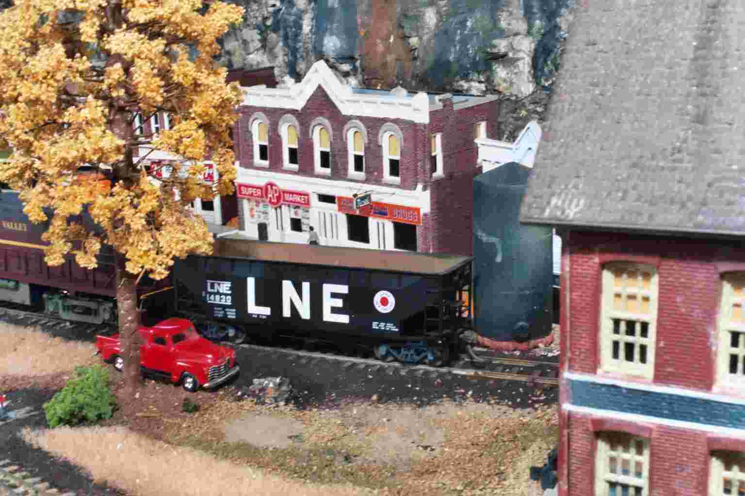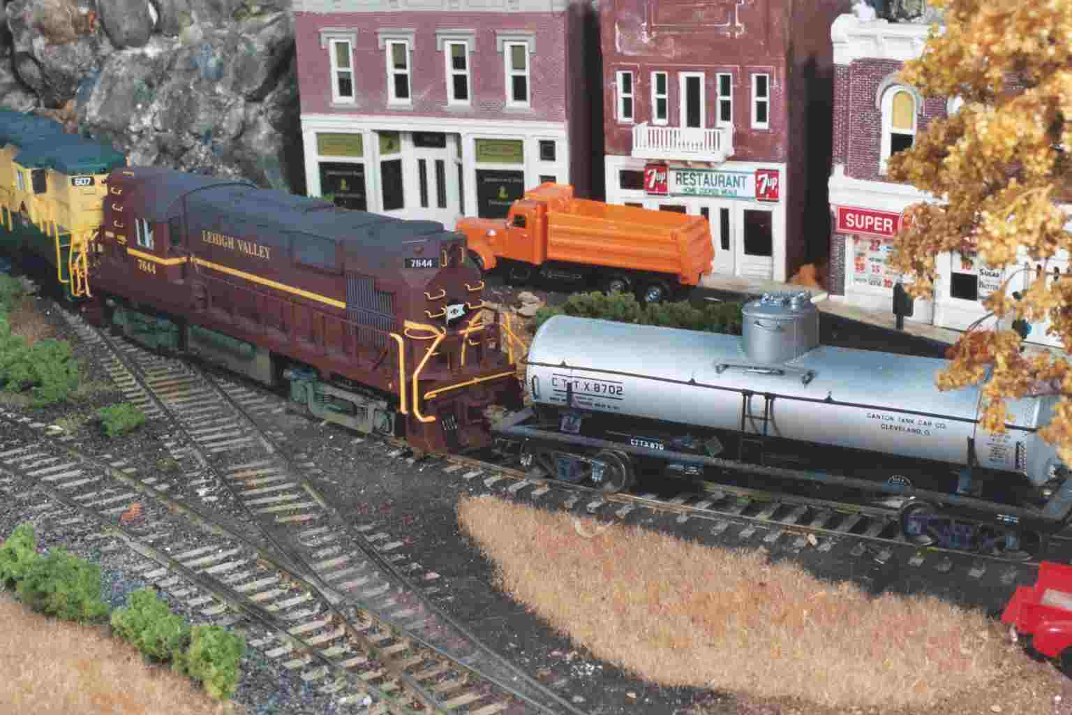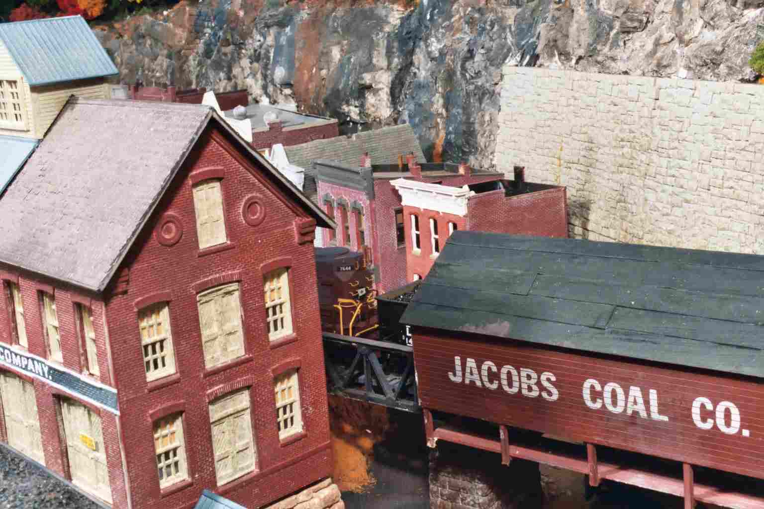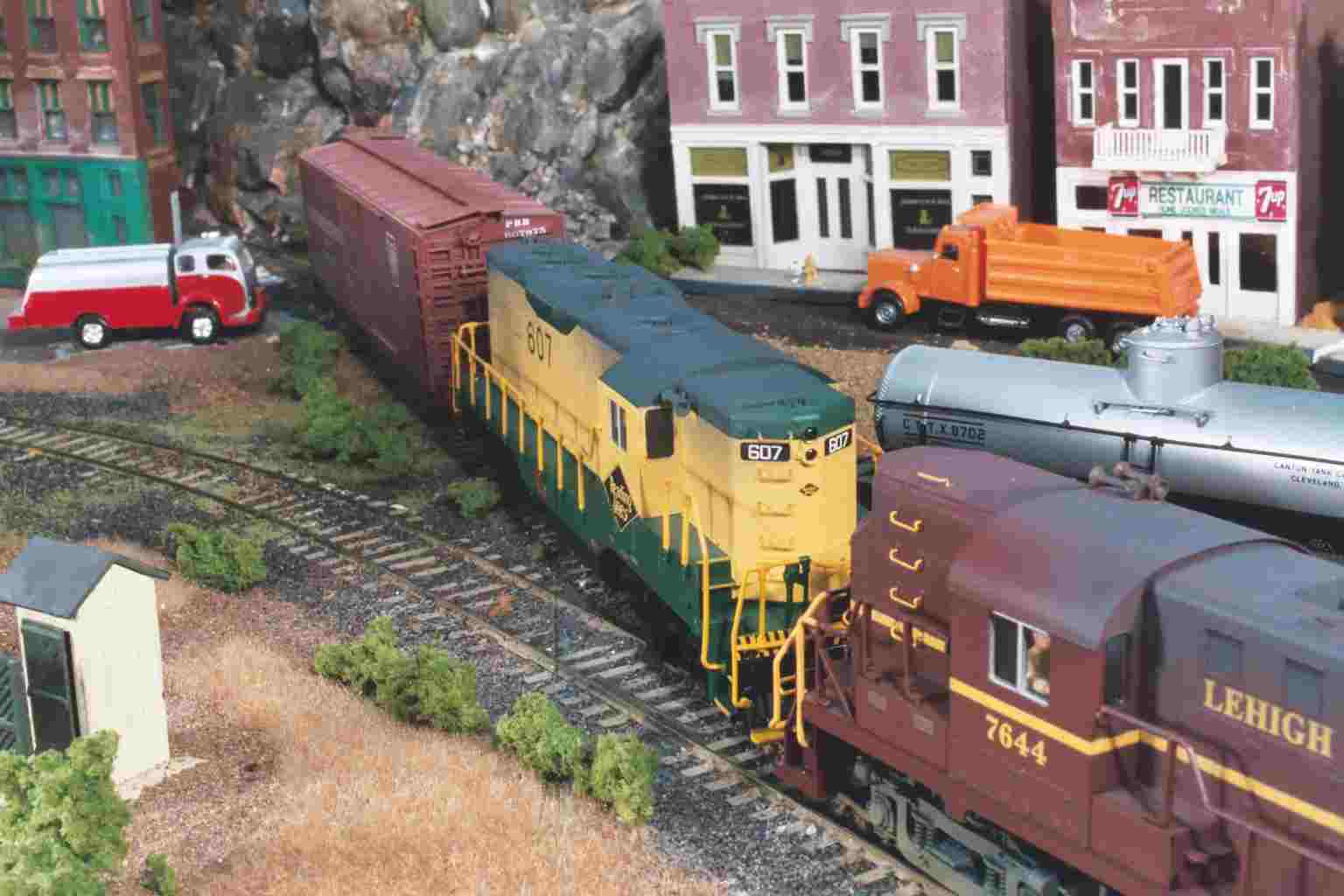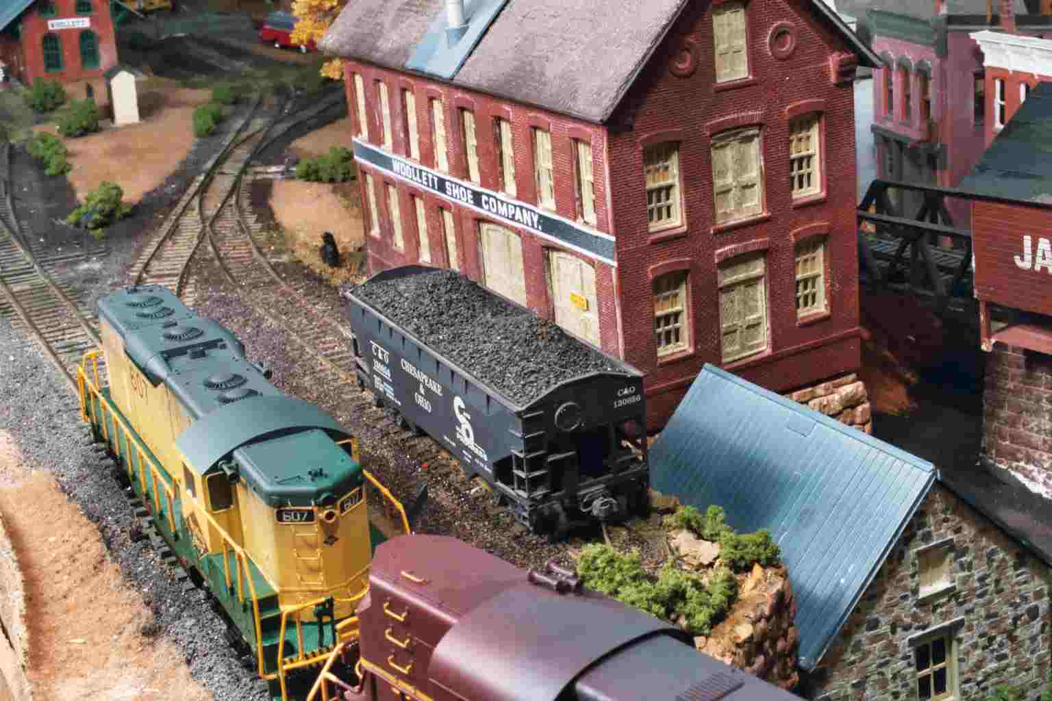 At left, the local is pulling into town past the Woollett Shoe Company. The only work in town is to pick up an empty tank car and hopper at the Jacobs Coal Company, but it's a complicated job.
