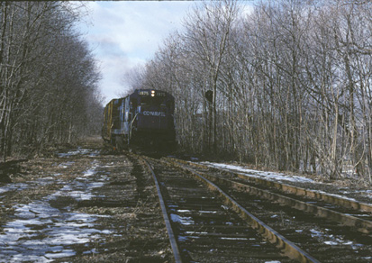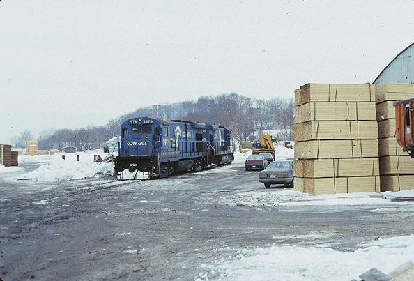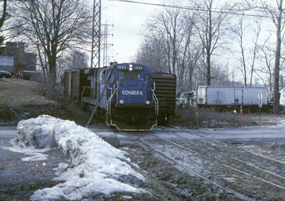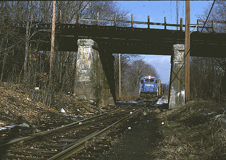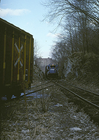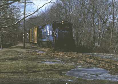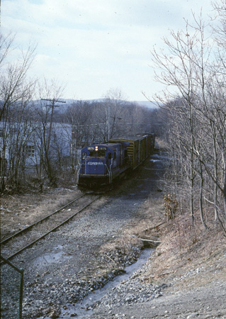 Poughkeepsie is served by Conrail's WAPO-10, usually called by 8am Monday-Friday. The power, usually GE B23-7s, is often located on the south end of the ex-Central New England yard, still called the CNE by the crews. Originally the connection between the historic Poughkeepsie & Eastern and the Hudson River Railroad, it also served as access to the New Haven's bridge and to the Maybook Line. Now this trackage into Poughkeepsie is called the Hospital Industrial Branch (named after previously serving the hospital's steam plant, now located at the switchback) and now connecting a few small industries in Poughkeepsie such as the Poughkeepsie Journal, an industrial scrapper, and a ceramic supplier.