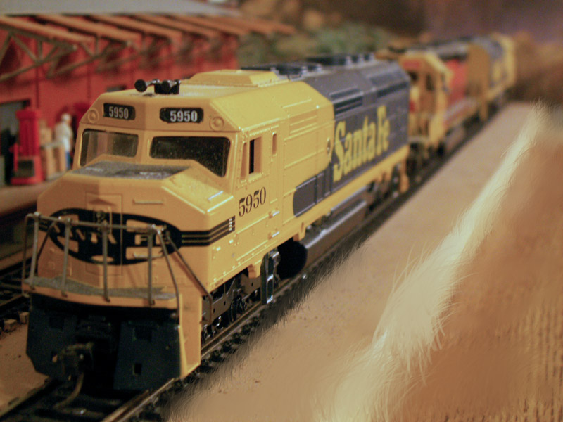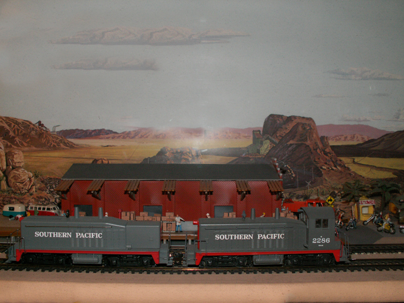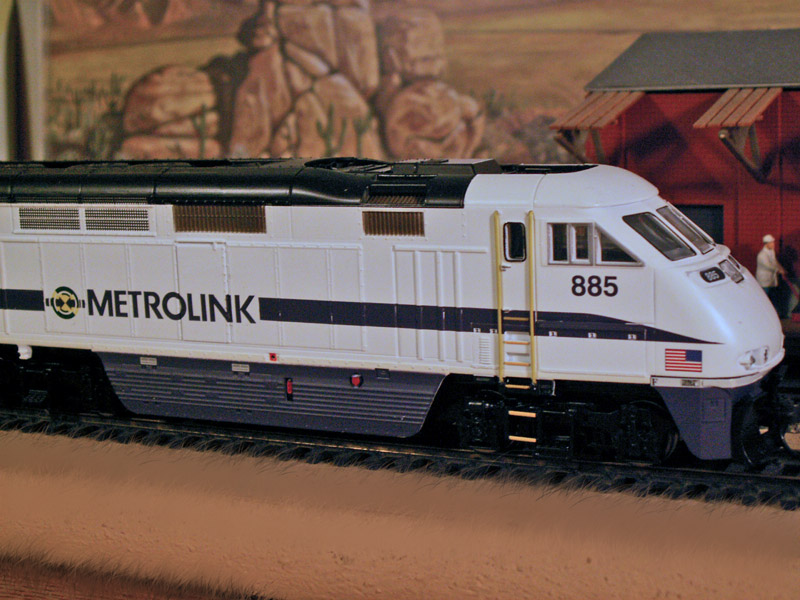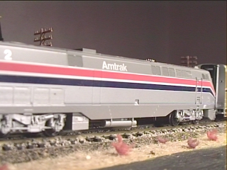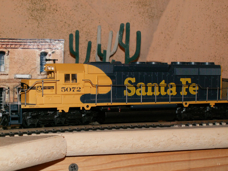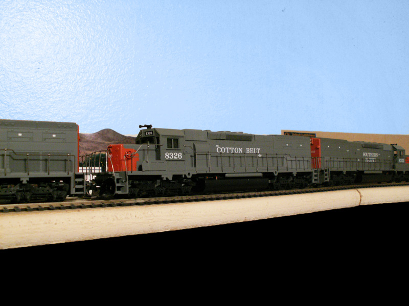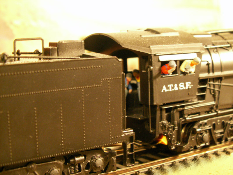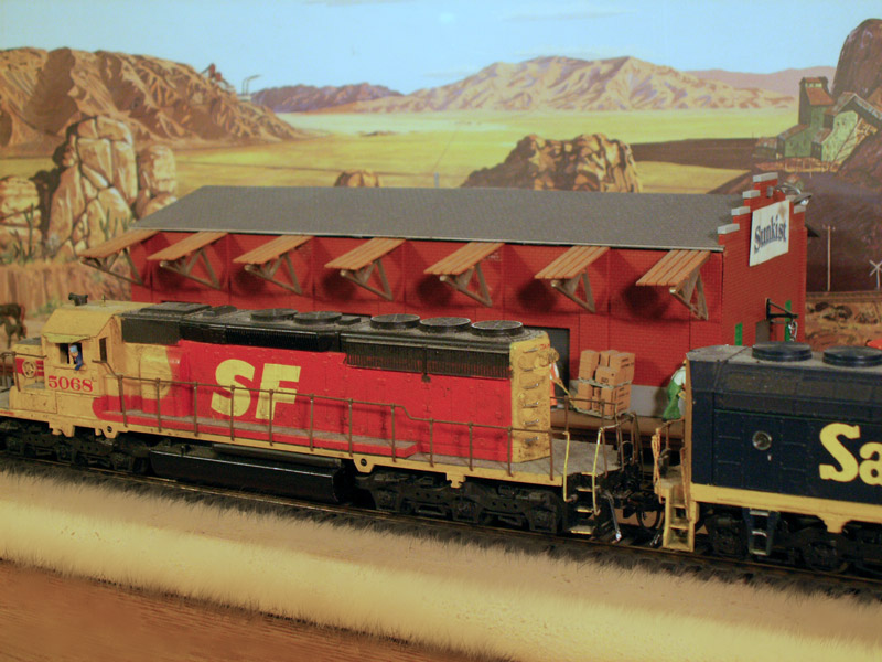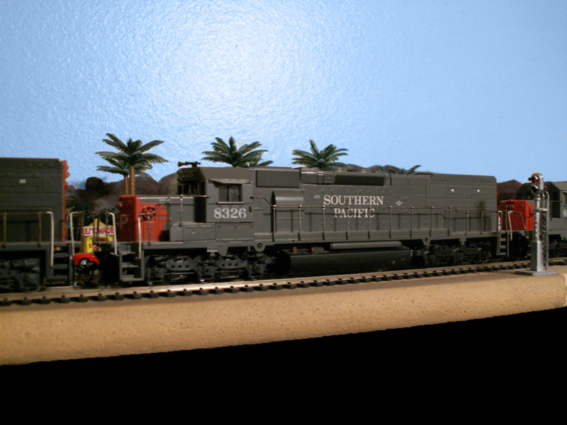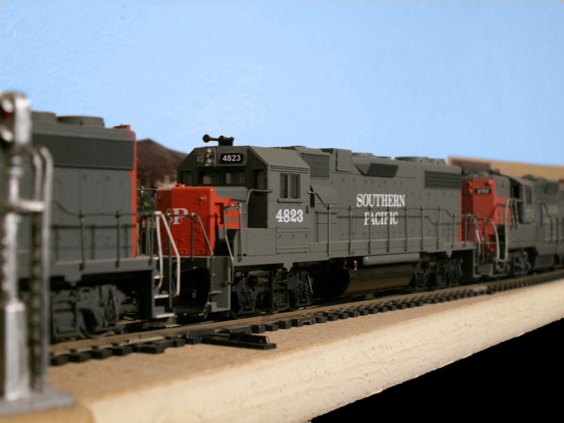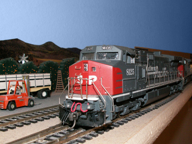 All locomotives are in some stage of being super detailed and weathered. Standard details are M.U.'s, snow plows, radio antennas and sun visors. Other details on some units include grab irons, air conditioners, and of course the crew. Handrails are painted and mounded grab irons are highlighted with a line of the proper color. Air intakes and exhaust are weathered. Older locomotives are weathered with more dirt, rust, and grime, etc., see rolling stock page for weathering techniques.