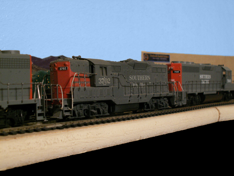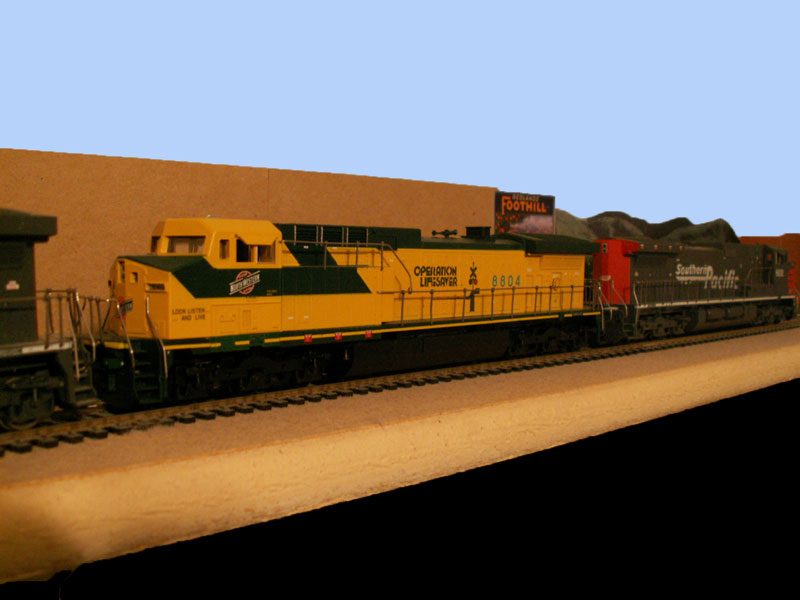 Wolf Mountain is one mean hill and there is never enough muscle available with out helpers and pushers. East bound trains always require more power to get up the hill. West bound trains don't need as much because it is downhill most of the way and what grade there is is, is nothing compared to the east bound side which climbs the 4,000 foot step, up from the Pacific Plate to the North American Plate, making it one of the steepest main line passes in the nation.Because of gear ratios and other differences, powered locomotives are only run with other powered locomotives from the same brand or dummy units. The Athearn loco's are nicely detailed with after-market parts and are very dependable and economic. The Atlas locomotives are vintage late 1970's but can still be found new in the box on the internet. They run great at very slow speeds, much slower than the Athearn's. They make the best locos for switching urban areas where driving slow looks so cool. The Walther's units are a good cross between the other two. They look great and run great. I don't know why nobody else has them. All locomotives have Kadee couples. Most have #5's. Units with snowplows have #26's in the front. Some units requires under or over set shanks. Use the height gauge to check proper height. I have tried some other brands of couplers and use them on rolling stock sometimes, however the plastic couplers don't last long mounted on the locomotives due to the tougher stresses that locomotives encounter during switching etc.