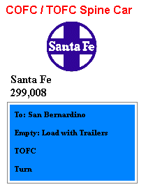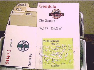 The 3 x 5 inch car cards are printed on a color printer and include the colorful logo of the owner (Santa Fe, etc.) The cards are printed like a deck of cards so that they can be held like a poker hand. This makes them easy to handle and sort through. Also printed on the card is the type of car (box car etc.), the car's owner, the car's number, it's reporting marks (A.T.S.F.), and it's destination when empty.
