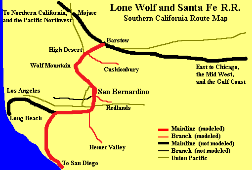 The small town of Lone Wolf is located on Wolf Mountain in the Southern California division. To the west of Wolf Mountain is San Bernardino and beyond the layout is Riverside, Orange, Los Angeles, San Diego counties. The orange groves of Redlands and Highland are modeled as a branch of the North End. The Hemet Valley is a large agricultural area as is most this western region. Los Angeles has several large industries and also consumes mass quantities of everything. Long Beach and San Diego both have large sea ports and a large percentage of Asian imports enter the country here in the form of containers full of electronics or automobiles which must be loaded onto enclosed auto carriers.