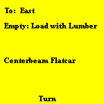 | Example 1 The Monday Morning Local has just returned to the yard. While on it's route it picked up an empty centerbeam flatcar. The car card says that when empty to return the car to the east. It just so happens that there is a need (waybill) for that type of car (centerbeam) in the east. So the yard switcher puts the car onto the eastbound train that it is assembling on track 3 in the yard. The train goes the the east. This may take a lap or two but eventually it will stop at the High Desert Staging yard. When it does all of the waybills are either turned or discarded. Cars with prop loads are now loaded or unloaded as directed. When the train resumes, it will be a new train. The new train leaves the staging yard and goes to it's destination, the main switching yard. From the main yard the car will be delivered to the lumber yard. With the order delivered the waybill is removed. Repeat the whole process. |