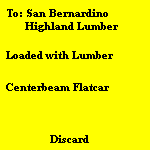 Next I figured out which businesses received loaded cars from off the layout. These cars will have to be routed off the layout first as empties so they can return with the proper load. A good example of this is centerbeam flat cars which arrive loaded with lumber from the pacific northwest. They are delivered to the local lumber yard. When the empties are picked up and returned to the yard they must be returned to their owner. Since there is no loads headed back that direction the centerbeam flat cars are returned empty with a waybill that sends the empty car off the layout to be loaded and when loaded, to be delivered to the local lumber yard.To keep things simple the waybill only lists the most important information: