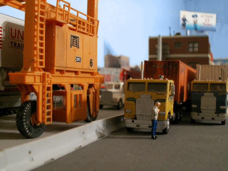 A truck driver waits for a cab over with a container to pass before climbing into his truck.