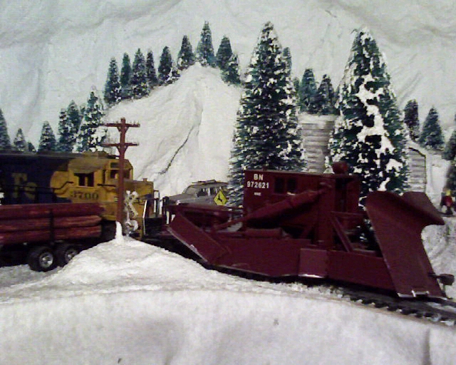 The Spreader, as they're referred to, does most of it's work on Lone Wolf Pass, cleaning up rock slides which are a given, during every rain storm. Winter storms can also mean snow at the top the pass. The spreader is a great snow plow and easily handles the job of keeping the mainline clear. Since Jordan spreaders have no tractive power of their own, they most be pushed by a locomotive. The locomotive's air compressor supplies air to the tank which feeds the mnemonic plow wings. The snow plow train is ran over the pass as an extra between the Foothill Siding and the High Desert Siding. It then returns to the Foothill Siding and lets a few trains go by, then plows the pass again if needed. Another snow train which has a flanger in tow also does the same run. Flangers clear the snow from between the rails then spreaders come along and push it out of the way.