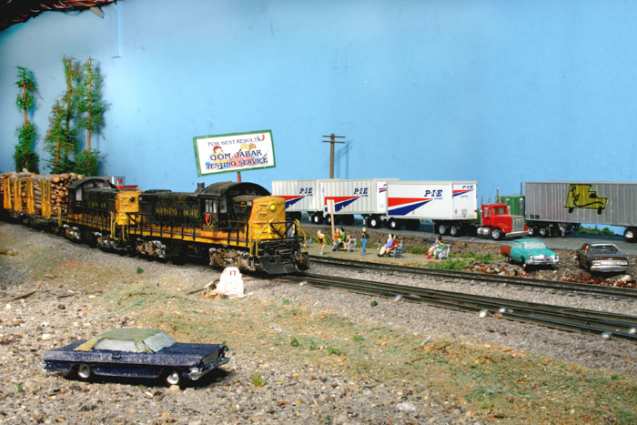 Railfans catch the Night Logger entering the Lewshinn industrial Park, where it will exchange its loads for empties at the Kleerkut Paper Mill.