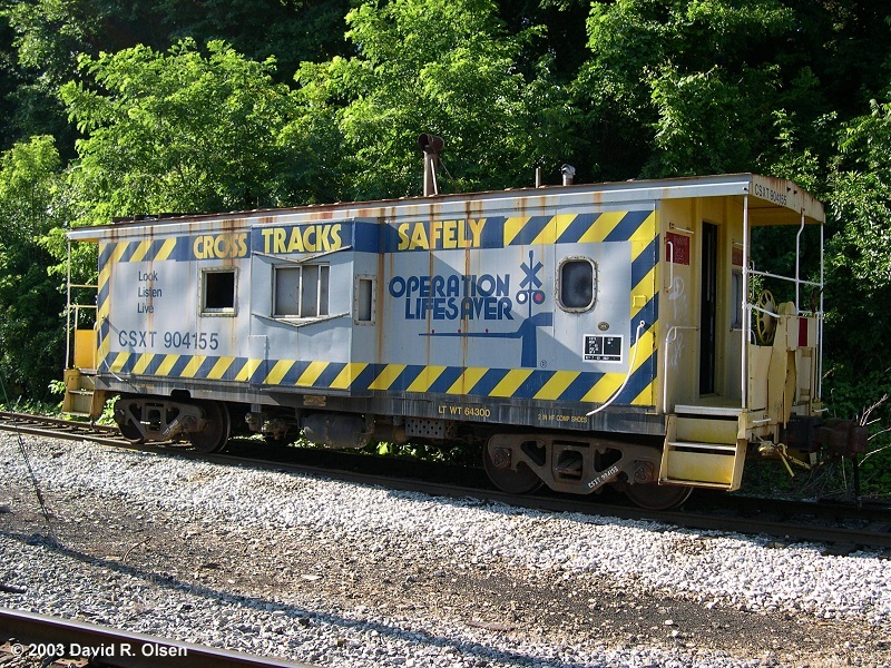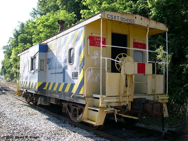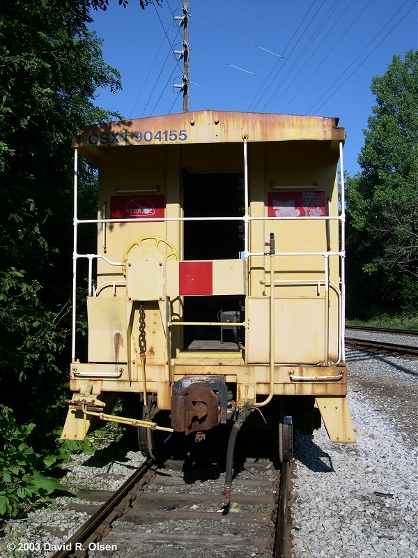 CSX Rolling Stock CSXT 904155, Elizabethtown, Kentucky. 21 June 2003. This caboose is used for switching operations around Elizabethtown. On this day, it was spotted on an industrial spur awaiting its next assignment. Photos Copyright 2003 by David R. Olsen. Go back to Other Railroad Photos page. Go back to main page.