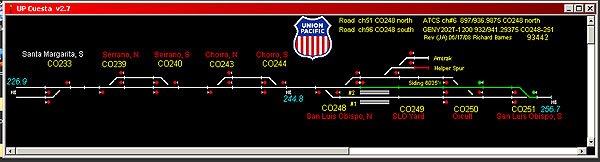 To run ATCS Monitor you will need the ATCS Monitor application on your computer and the San Luis Obispo and Cuesta Grade monitoring package. The application can be found at the ATCS Monitor Yahoo Group. To download the file one must be join the group. The Cuesta Grade Monitoring package can be found on the group, but I also keep a copy of it on my site. The version of the monitoring package I keep on my site is the most up to date, while the version on the yahoo side may be quite old. For this reason I would suggest using the version kept on my site (the link below).