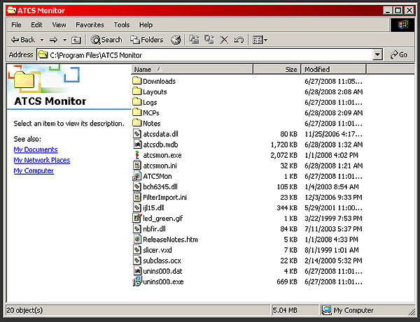 Installing ATCS Monitor is no different than any other windows program. Just run the installer file, and install the program. Somewhere in the process it may complain of one or more missing files. Do not worry about this, just click Ignore, and continue. Some of these files are not included in all versions of windows, and some are used for more advanced features such as layout editing, and have to be installed separately. For simplicity's sake I would suggest installing ATCS Monitor in the default location (C:\Program Files\ATCS Monitor) because I will refer to this throughout this page. This is the default location for Windows 98, NT, 2000, XP, and Vista. Other versions of Windows may be different.
