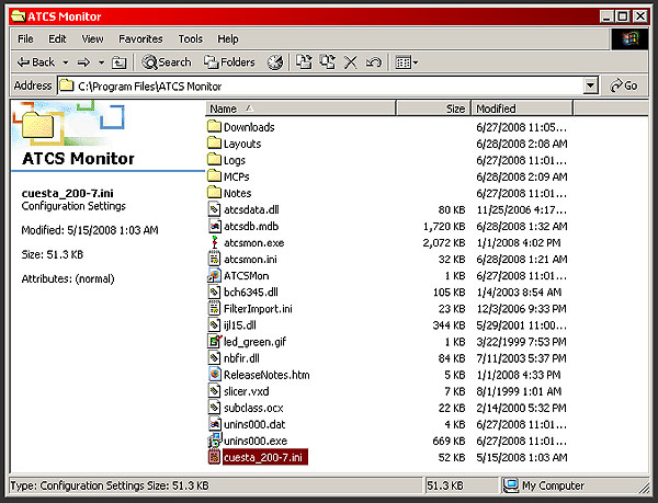 Each of these three files needs to go in a specific place. The file cuesta_200-7.ini must be placed in the main ATCS Monitor directory (C:\Program Files\ATCS Monitor).