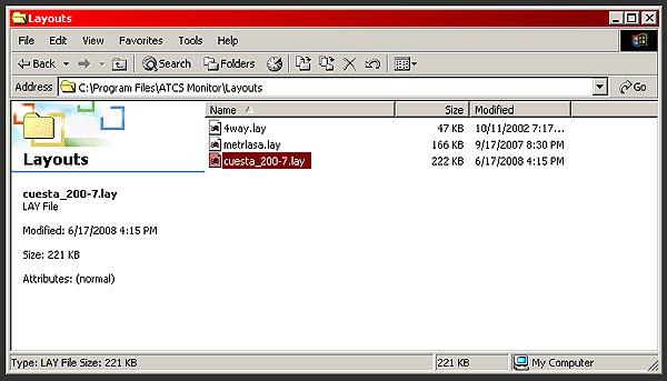 The cuesta_200-7.lay file must be placed in the Layouts directory (C:\Program Files\ATCS Monitor\Layouts).