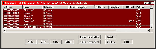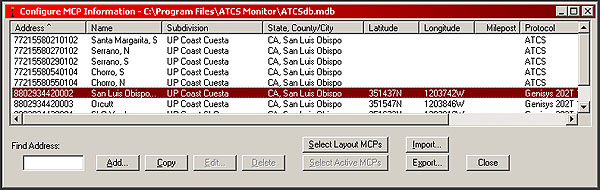 Now click the Delete button on the window to delete all of these MCPs. After clicking the delete button it may take the program a few seconds to delete all the MCPs, but soon no MCPs should be left. Now click the Import button. This will bring up a list of files in the MCP directory where the cuesta_200-7.mcp was placed earlier. Select this file and click Open. The Configure MCP Information window should now look like the picture below, with all the MCPs for the San Luis Obispo and Cuesta Grade package displayed.