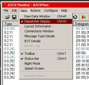 If the dispatcher display does not come up you can check if it is enabled by clicking on "View > Dispatcher Display". There will be a check next to the word Dispatcher Display if it is enabled. This is show in the picture below.