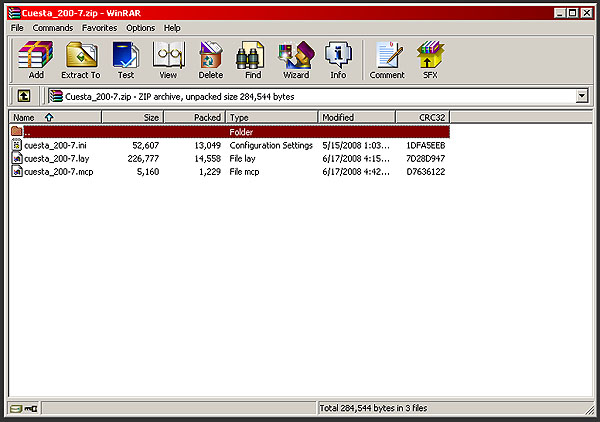 Once in this directory open the cuesta_200-7.zip file that you downloaded. There should be three files within it. They are: - cuesta_200-7.ini - cuesta_200-7.lay - cuesta_200-7.mcp A view of the cuesta_200-7.zip opened in WinRAR is shown below.