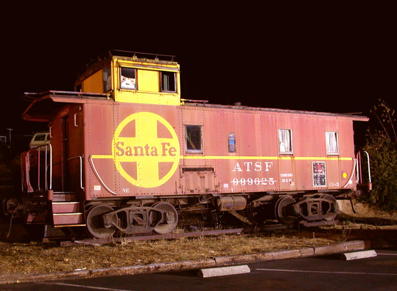 A Santa Fe caboose by a parking lot in Oakhurst CA, not far from Yosemite National Park.