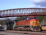 A BNSF 8-40CW along with three BNSF SD40-2s are in San Luis Obispo with a train 5 cars long. I'm not sure why they got roughted through San Luis Obispo, or why they had four engines for 5 cars, but it did make for an interesting change of pase in SLO.