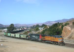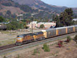 A Union Pacific SD70M is at the head of the IOALB. The train stopped in San Luis Obispo the previous night and will be heading town to Long Beach with its load of empty container cars from Oakland.
