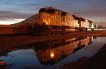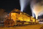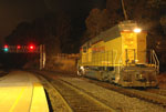 A UP bare tables train sits in SLO for the night. This shot was exposed to 30 seconds to get enough light. The sky appears very light because the fog reflected a lot more light than what was on the scene on its own.