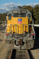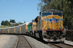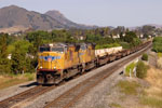 UP SD70M number 3886 leads a bare tables train south through San Luis Obispo after having just received a new crew.
