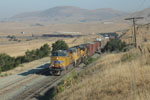 A Union Pacific freight with six engines makes its way north on Cuesta Grade. The rusty thing beneath the engines is an old SPMW dump car that from the looks of it has been derailed there a long time.