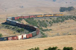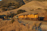 Two Union Pacific 8-40Cs pull a rail train through the smaller of the two Horseshoe curves on Cuesta Grade in San Luis Obispo.