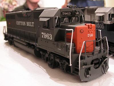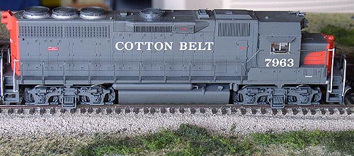 The Cotton Belt GP40R started out as an out of the box Atlas GP40. Most of the work went into the battery boxes and fuel tank. The fuel tank was always a pet peave of mine with the Atlas GP40 that they made the fuel tank look so shallow, I trimmed and filed the ears down and filled in the holes that were now revealed between the frame and the tank. I didn't do any of the fancy plumbing and traction motor cables since I lacked good photos of the prototype. Having the tank look better was a big step for this model.
