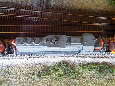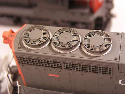 The Battery Boxes were fabricated from several Cannon and Co. resources. I used the dash-2 line sub-base parts and grafted on the SP split battery box doors removing 2 of the horizontal ribs. The prototype photos I've seen have flat split battery box doors. The big doors next to the nose in front of the cab were pieced togother from three different C&Co. doors. Harry Wong described a technique he learned from Paul Ellis with the luevers. The trick was to pick up the Detail Associates louvers for a GP9 package, sand the back down the back so you could see light through them easily, trim them in half width, and glue them onto the side of the door. After all that work, it cast a dark shadow on doing any more GRIP rebuilds. The louvers were the easy part. Building the big door was harder and much more stressful trying to get everything cut accurately in such a small surface area.
