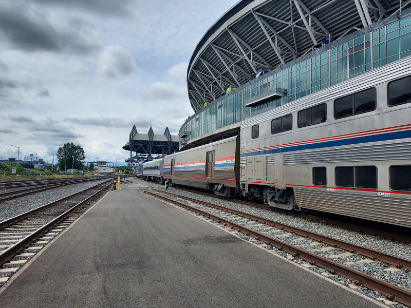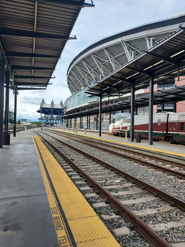 The other end of the TALGO VIII set is this distinctive cab car that is also the auxiliary power car for the train. The south end of the King Street Station platforms lies in the shadow of Seattle's Lumen Field, the home stadium for the NFL Seahawks, MLS Sounders and NWSL Reign. In the far background is the retractable roof for the city's other stadium in the SODO district, T-Mobile Park, the home of Major League Baseball's Mariners. The stadium's roof rolls on a track and is stored over top of the BNSF main tracks and the leads to the Amtrak/Sounder coach yard south of the station. |