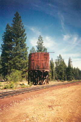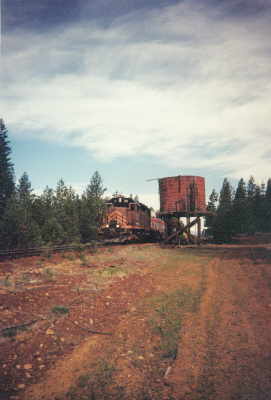 ((Picture: #171) 5/2003. A westbound freight with 24 empties for the Burney area passes Bartle tank. |
