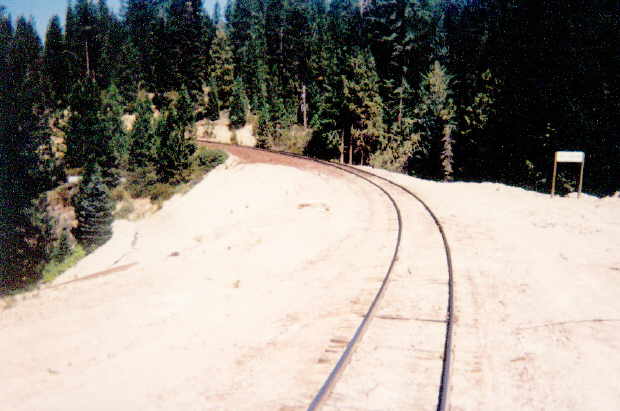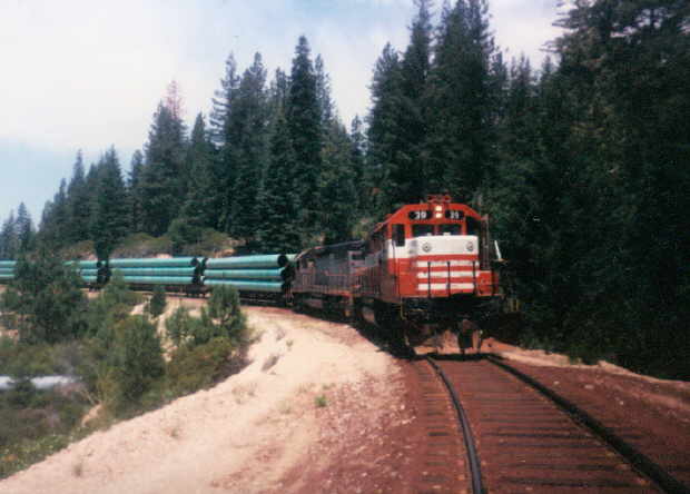 6/1992. A loaded pipe train has momentarily paused on top of the fill while the crew attempts to decipher a minor mechanical problem in the trailing unit. |