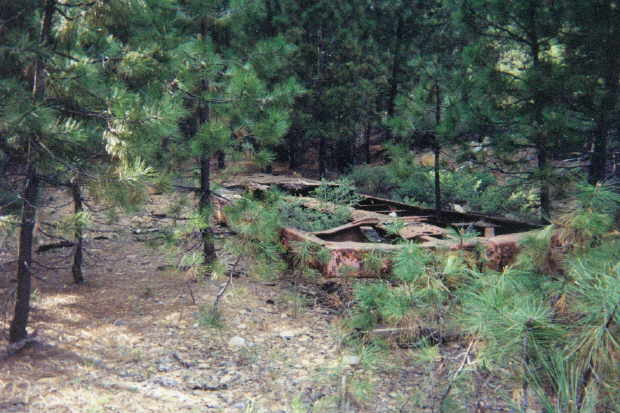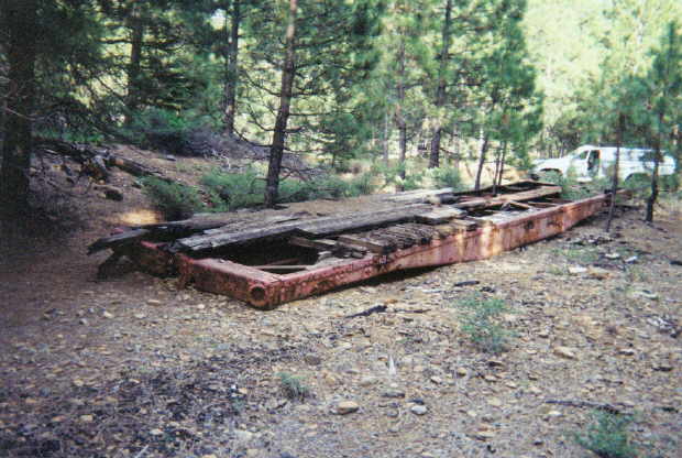5/2003. These remains of an old flatcar lie adjacent to the lumber company spur that left the McCloud River mainline at Dry Creek near where the spur crossed the McCloud River. |